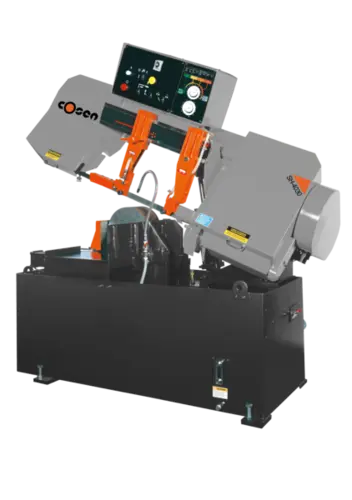 COSEN SH-4030, a new semi-auto horizontal band saw. Cuts up to 12" in rectangles, squares, and rounds with a 1.3" x 0.042" blade. Powered by a robust 5 hp motor and featuring a spacious 150" blade length for versatile applications.