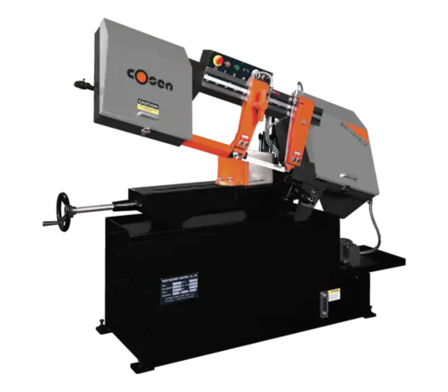 COSEN MH-1016JA Horizontal Band Saw, new condition. Cutting capacities: Rectangular (HxW) 10"x14.6", Round 10", Square 9". Features 2 hp power, 1" blade width, 0.035" blade thickness, and 132" blade length—perfect for precise cutting needs.