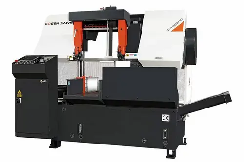 420mm Automatic horizontal dual column type band saw's columns are strengthened, and the beams are structurally strong. The roller design enlarges the fine grinding column of the straight beam to support and guide the whole cutting operation of the bow, and the beam is cut from above, which strengthens the gate structure, which makes the bow rise and fall, and the cutting speed is greatly increased.