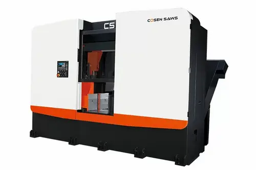 The band saw with NC-Program features Cosen's NC control system for mass production. The programming allows for an automatic first cut, storage of up to 100 jobs, plus all other features included on the SNC-100 control system. The ball screw driven saw frame rides on linear guide ways (rails).