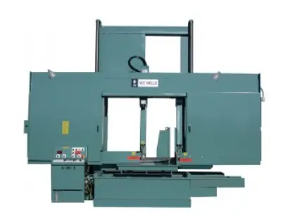 W.F. WELLS S-40-3 Horizontal Band Saw, new condition. Features 40" x 40" rectangular capacity, 15 hp motor, 2" blade width, 0.063" blade thickness, and 29' blade length. Ideal for precision cutting needs.